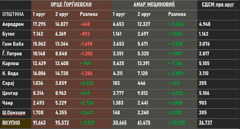 Околу 4.000 гласа повеќе има направено како позитивна разлика во вториот круг од оние кои ги имаше Шукова што веројатно е дополнување кое го добил од поддржувачите на Стевчо Јакимовски.