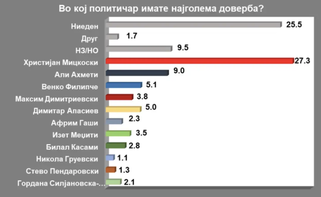 Во однос на довербата во политичарите, на прашањето „Во кој политичар имате најголема доверба?“, 27,3 проценти го посочиле Христијан Мицкоски. Наспроти ова, 25,5 проценти одговориле „ниту еден“, а 9,5 проценти немале одговор.