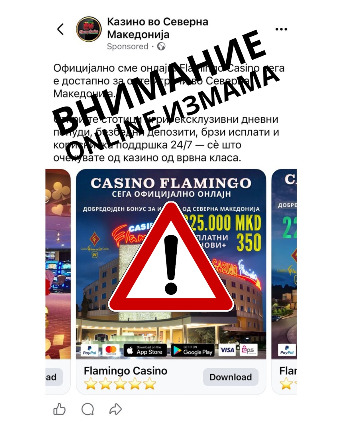 Веќе подолг временски период на социјалните мрежи масовно циркулираат лажно креирани дигитални вести кои во суштина се онлајн измама која има за цел да навлекува посетители кои свесно и со умисла се ставаат во заблуда дека наводно нашите компании-членки приредуваат онлајн игри на среќа. Овие измамнички вести упорно се пласираат на македонски и англиски јазик.