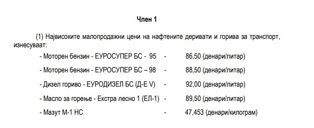 Малопродажните цени на бензините ЕУРОСУПЕР БС-95 и ЕУРОСУПЕР БС-98 и на Екстра лесното масло за домаќинство на (ЕЛ-1), се поголеми за 7,00 ден/лит, во однос на малопродажните цени утврдени со одлуката за утврдување на највисоки малопродажни цени на нафтените деривати и горива за транспорт од 09.03.2026 година и со тоа малопродажната цена на ЕУРОСУПЕР БС-95 изнесува 86,50 ден/лит, малопродажната цена на ЕУРОСУПЕР БС-98 изнесува 88,50 ден/лит, додека малопродажната цена на Екстра лесното масло за домаќинство на (ЕЛ-1) изнесува 89,50 ден/лит.