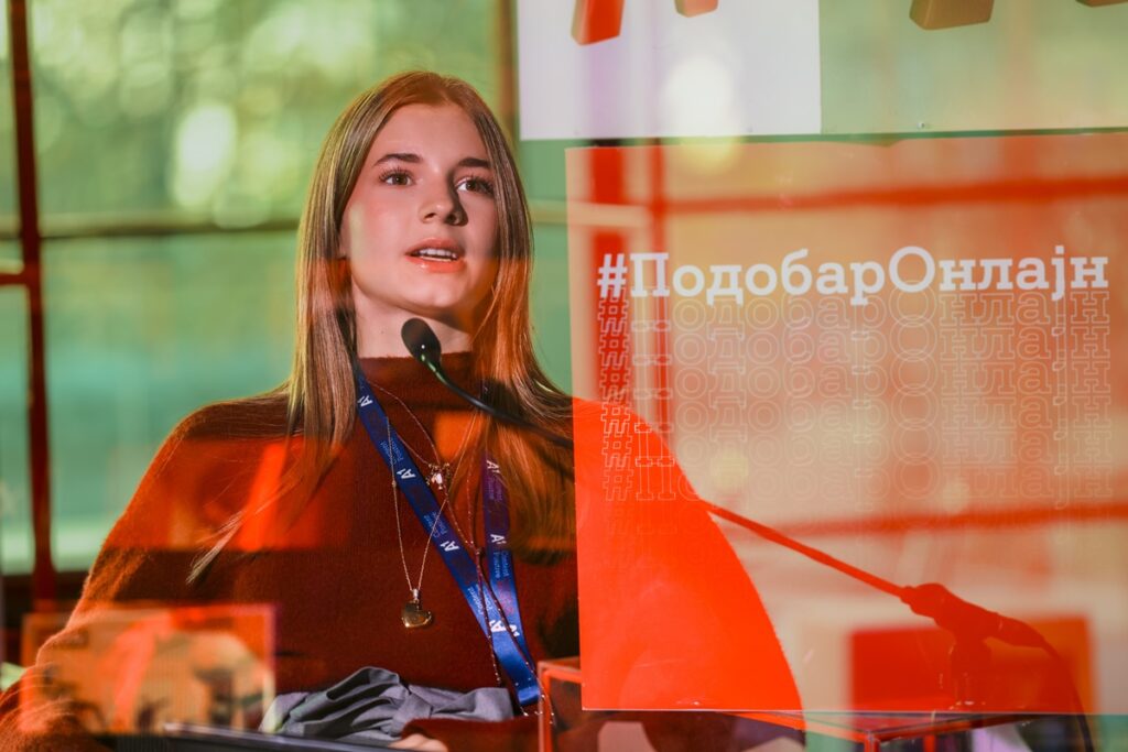 „Моето регистрирано време поминато пред екран во просек е околу 10 часа дневно, од кои значителен дел се поврзани со училишните обврски. Таквата статистика дури и мене ми изгледа премногу и се обидувам да креирам рутини кои реално функционираат, но треба да се има волја за тоа. Голем предизвик за нас тинејџерите е притисокот од социјалните мрежи, како и, најчесто, неоправданите критики. Според мене, клучниот збор е одговорност. Има однесувања и норми кои се прифатливи и до кои треба да се придржуваме. Ние тинејџерите не можеме да делуваме институционално, но лично би сакала да има некоја законска рамка за тоа што и колку е дозволено во тој онлајн-простор. Накратко, ни треба онлајн-простор каде младите ќе се чувствуваат прифатено, а не осудувано“, истакна Мукаетова.
