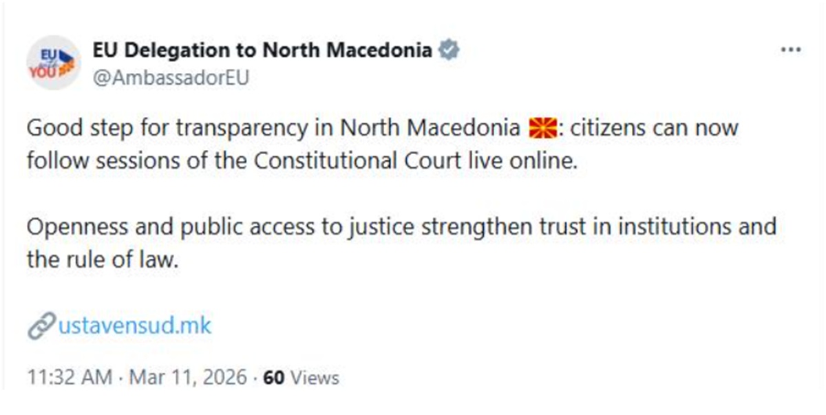„Добар чекор за транспарентноста во Република Македонија, граѓаните сега можат да ги следат седниците на Уставниот суд онлајн, во живо. Отвореноста и јавниот пристап до правдата ја зајакнуваат довербата во институциите и во владеењето на правото, пишува во постот на ЕУ Делегацијата.