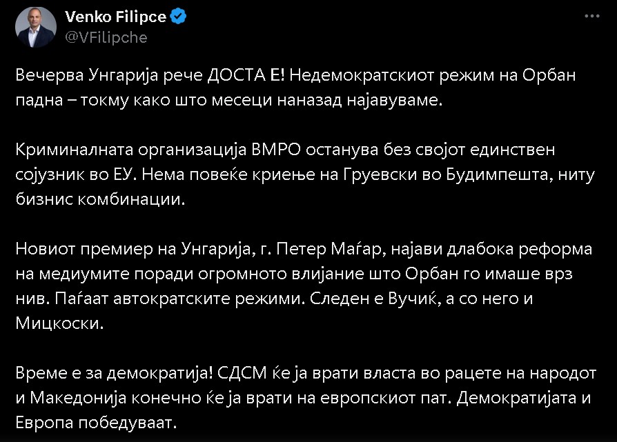 Криминалната организација ВМРО останува без својот единствен сојузник во ЕУ. Нема повеќе криење на Груевски во Будимпешта, ниту бизнис комбинации. Новиот премиер на Унгарија, г. Петер Маѓар, најави длабока реформа на медиумите поради огромното влијание што Орбан го имаше врз нив. Паѓаат автократските режими. Следен е Вучиќ а со него и Мицкоски. Време е за демократија! СДСМ ќе ја врати власта во рацете на народот и Македонија конечно ќе ја врати на европскиот пат. Демократијата и Европа победуваат.“, стои во реакцијата на лидерот на СДСМ, Венко Филипче по поразот на Орбан во Унгарија.
