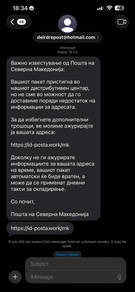 Повторно кружат лажни пораки кај граѓаните во име на Пошта на Македонија. Имено, револтирани граѓани испратија фотографии до нашата редакција на кои може да се забележи дека добиле порака за доставување на пратка иако не нарачале ништо.