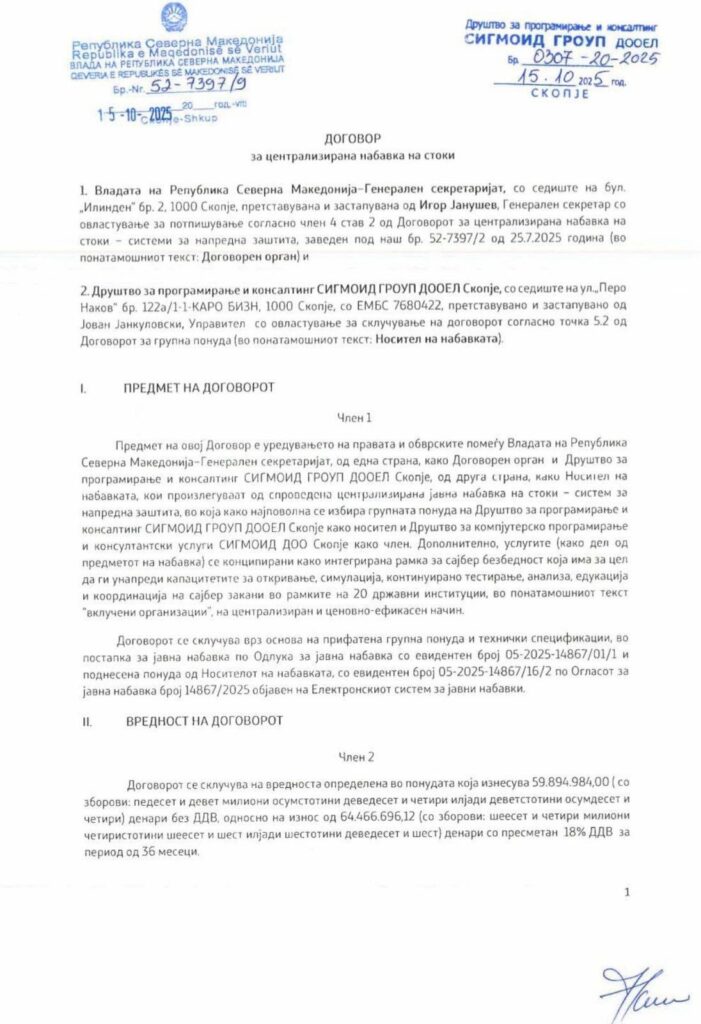 Само после два дена, има нов договор, склучен на 15.10.2025, со Генералниот секретаријат на Владата, вреден: речиси милион евра (980 илјади евра).