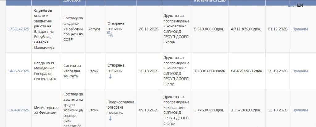 Еве го првиот договор, со Министерството за финансии, склучен на 13.10.2025 година, вреден околу 60.000 евра.