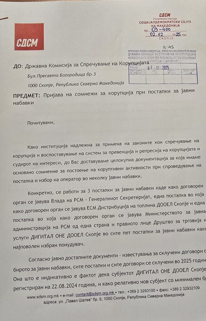 (ФОТО+ВИДЕО) Огњеновиќ: СДСМ поднесе пријава до ДКСК за тендерите од 9 милиони евра