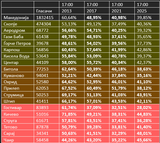Ова е значително најмал процент на излезеност, во споредба со изборите од 2013 година. Тогаш, до 17 часот излезеноста била 60,64%. Денешниот пресек на излезеност е помал и ако се спореди со оној на изборите во 2017(48.95), и 2021 (40,95%).