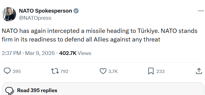 Тензиите на Блискиот Исток продолжуваат да се рефлектираат врз безбедноста на регионот. Портпаролката на Алијансата, Алисон Харт, потврди дека системите за противвоздушна одбрана на НАТО успешно неутрализирале уште една закана насочена кон турската територија.