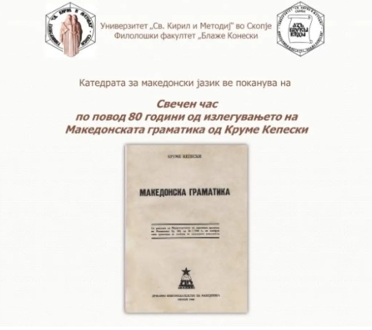 На Филолошкиот факултет „Блаже Конески“ во Скопје денеска ќе се одржи свечен час по повод 80-годишнината од објавувањето на „Македонската граматика“ од Круме Кепески.