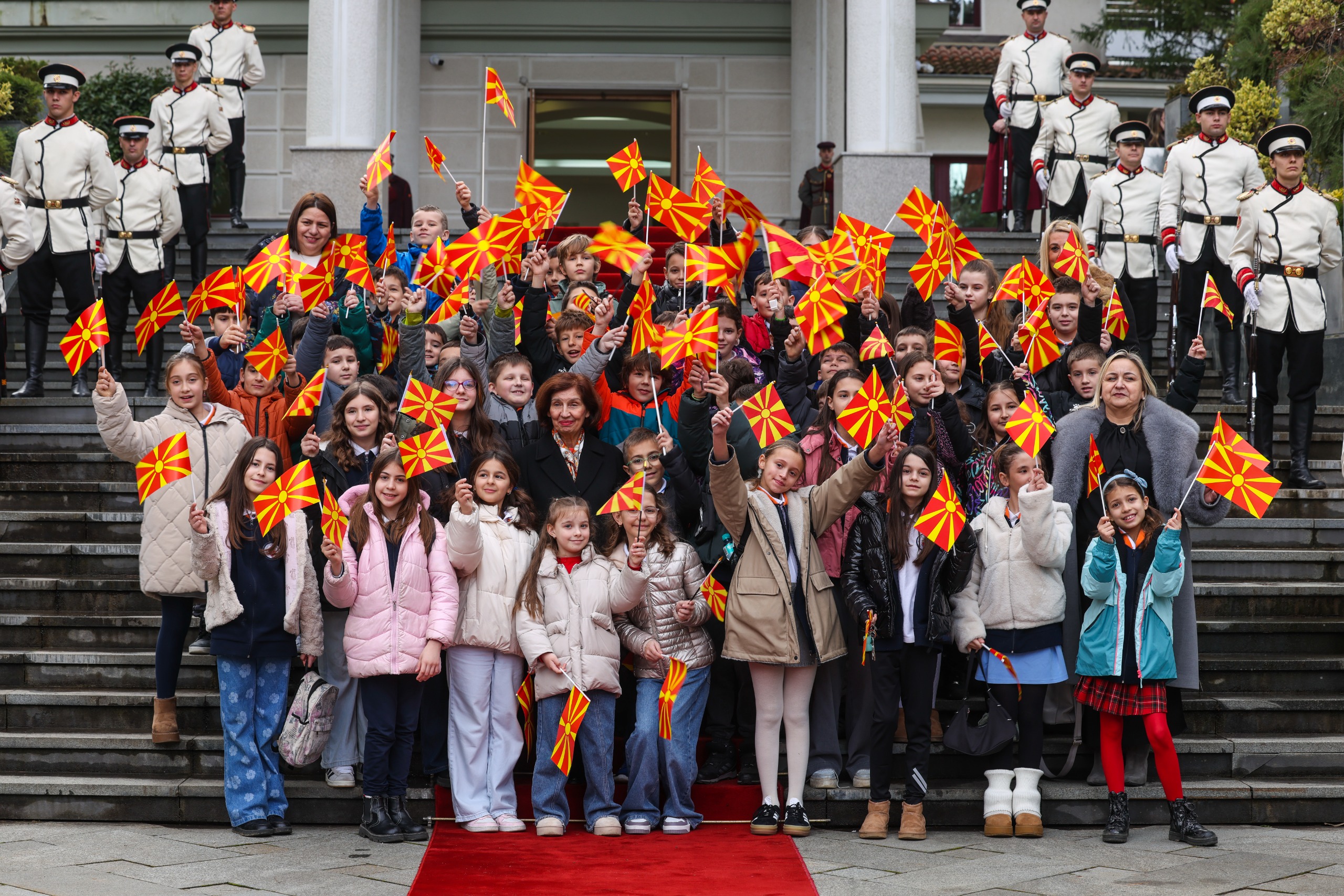 Повеќе од 170 основци од скопските училишта „Ѓорѓија Пулевски“ и „Кочо Рацин“ и од училиштето „Св. Наум Охридски “ од Охрид, денеска ја проследија церемонијата на свечено менување на државното знаме, којашто во Кабинетот се одржува секој втор петок во месецот во знак на оддавање почит кон државата.