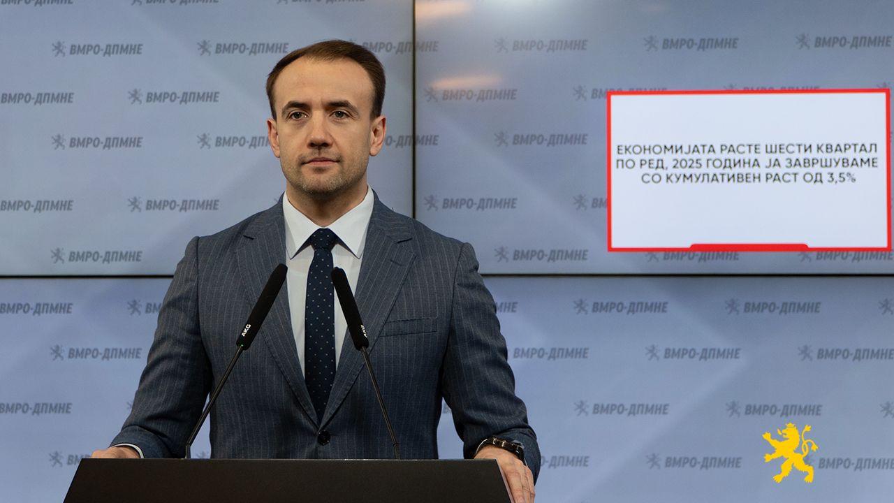 Денес зборуваме со бројки, а бројките се најсилниот аргумент. Според официјалните податоци на Државниот завод за статистика, економијата во четвртиот квартал од 2025 година порасна за 3,8 проценти. Тоа значи дека веќе шест квартали по ред имаме стабилен и континуиран економски раст. Кумулативно, во 2025 година растот изнесува 3,5 проценти. Тоа не е случајност. Тоа е резултат на внимателна економска политика, фискална дисциплина и поддршка на стопанството, изјави на денешната прес-конференција Бојан Стојановски од ВМРО-ДПМНЕ.