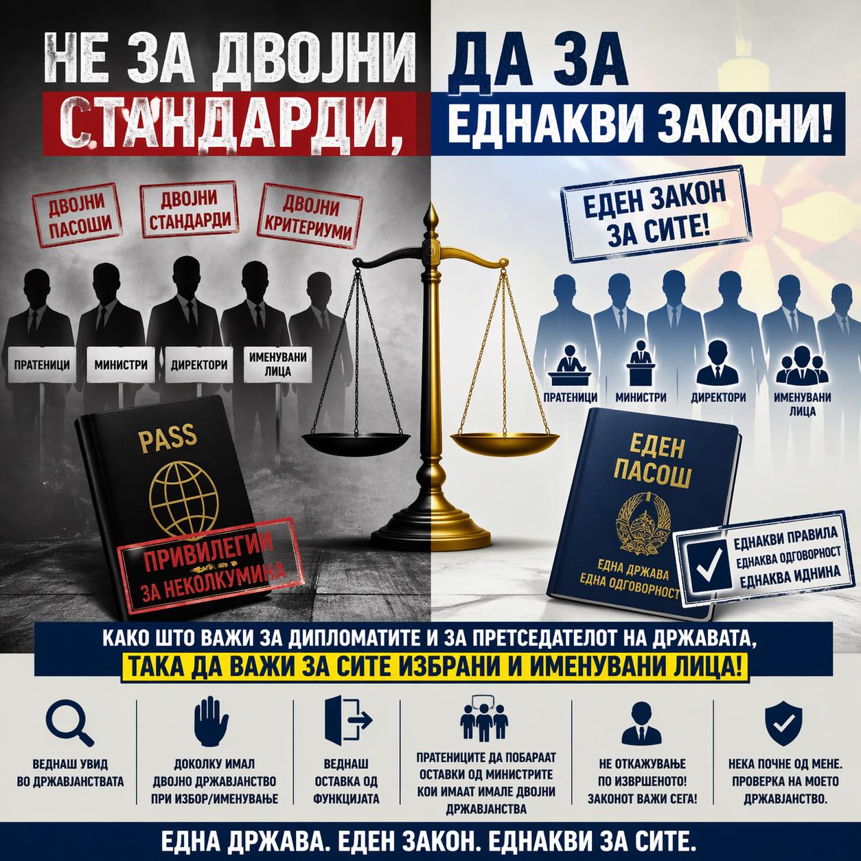 „Нели ви е преку глава од дволичноста и двојните стандарди на „големите“ партии? Законот треба да важи еднакво за сите! Како што важи за претседателот на државата, за јавниот обвинител, за амбасадорите – така да важи и за сите избрани и именувани лица. БЕЗ ИСКЛУЧОК. ОД ДЕНЕС! Еве, нека немаат двојно државјанство и пратениците, и министрите, и директорите – сите. И тоа да важи за СЕГАШНИТЕ, без одлагање“, пишува во објава на социјалните мрежи претседателката на Либерално-демократската партија (ЛДП) и пратеничка во Собранието, Моника Зајкова.